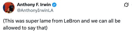 对于詹姆斯的行为,湖人队记Anthony F. Irwin更新社交媒体发文吐槽:“詹姆斯的做法真的是太差劲了,我们都有权这么说。”